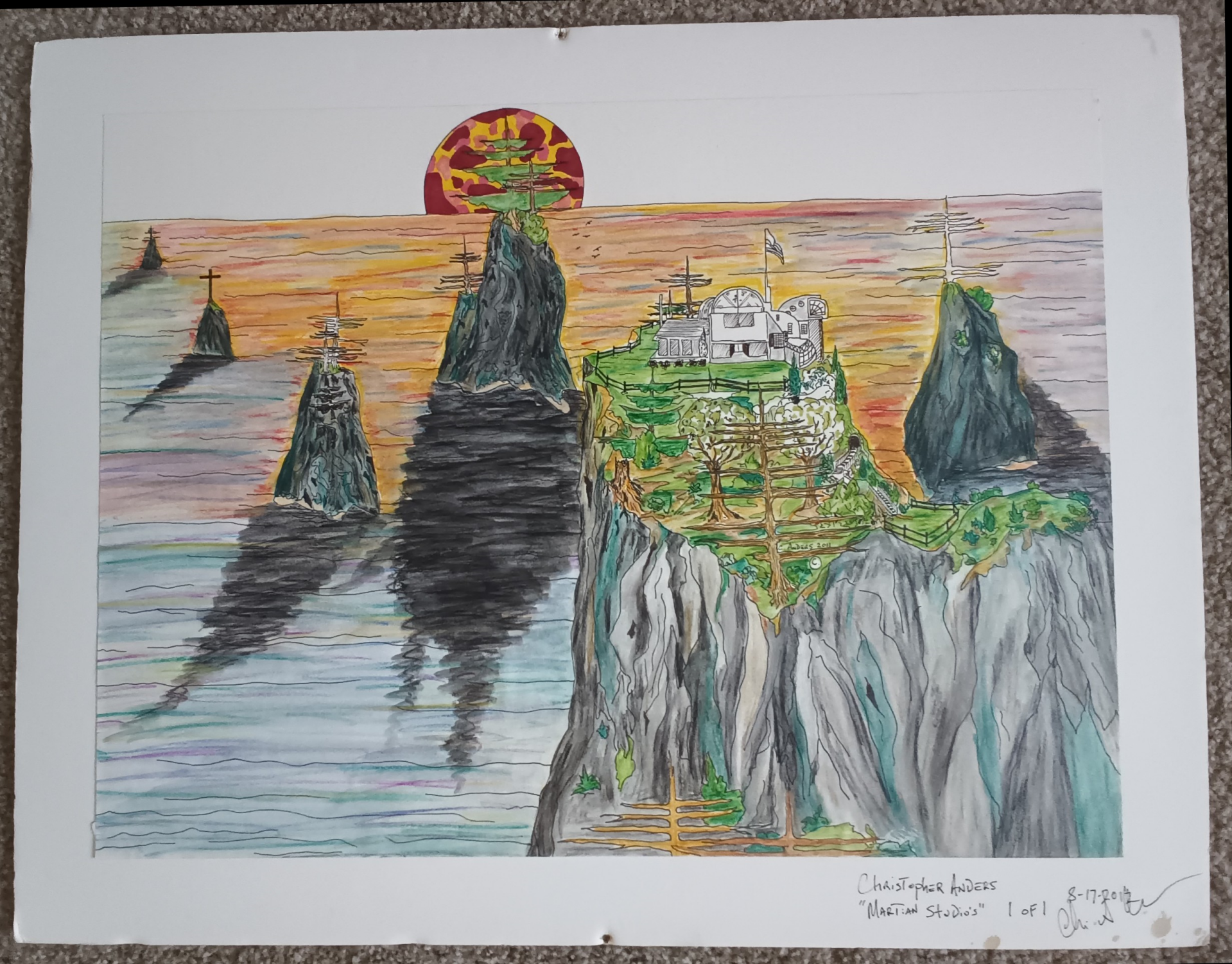 original drawing 18x24 inches dry mounted on foam,overal width is22inx28in hieght, ink and colored pencils on paper